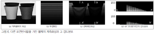 Ä«¸Þ¶óÀÇ À¯È¿ÀûÀÎ °­µµ°èÃø ·¹ÀÎÁö Áï, °¨±¤Æ¯¼ºÀÇ ±Ù»çÀûÀÎ ¼±ÇüºÎºÐÀ» °üÃøÆÐÅÏ ÁÙ¹«´ÌÀÇ ÀÌ»óÀûÀÎ °­µµºÐÆ÷¹üÀ§·Î ĪÇϸç, ÀÌó·³ °­µµºÐÆ÷¸¦ °¡Áø °üÃøÆÐÅÏÈ­»óÀ» ÀÌ»óÀûÀÎ °üÃøÆÐÅÏÈ­»óÀ̶ó°í ĪÇÑ´Ù. ÀÌ»óÀûÀÎ °üÃøÆÐÅÏÈ­»óÀ» ÃëµæÇÒ ¼ö ÀÖ´Ù¸é ÀÎÁ¢ÁÙ¹«´Ì °£ÀÇ °­µµÂ÷°¡ Ä¿Á® °íÁ¤¹ÐµµÀÇ ÁÙ¹«´Ì ¾îµå·¹½º °ËÃâÀÌ °¡´ÉÇÏ´Ù. ±×·¯³ª ½Ç°èÃø½Ã, °èÃø¹°Ã¼ÀÇ »öÀ̳ª Ç¥¸é¹Ý»çÀ² µîÀÇ ¿µÇâ¿¡ ÀÇÇØ ÀÌ»óÀûÀÎ °­µµºÐÆ÷¸¦ °¡Áø È­»óÀ» ¾òÀ» ¼ö ¾ø´Â °æ¿ì°¡ ÀÖ´Ù. ±×¸² 6Àº ±× ÀÏ·ÊÀÌ´Ù. °èÃø¹°Ã¼´Â ´Ù¸¥ »öÀÇ µµ±âÀ̰í, Ä«¸Þ¶ó´Â 3CCD µðÁöÅÐ Ä«¸Þ¶ó, ÃÔ¿µ¸ðµå´Â ÀüÀÚµ¿¸ðµåÀÌ´Ù. ±×¸² 6(a)´Â °èÃø¹°Ã¼ÀÇ È­»ó, (b)´Â °­µµ°¡ 40¿¡¼­ 210±îÁö ¼±ÇüÀûÀ¸·Î º¯È­ÇÏ´Â Åõ¿µÆÐÅÏÀÌ´Ù. ±×¸² 6(c)´Â °üÃøÆÐÅÏÈ­»ó, (d)´Â °¢°¢ AA¡¯¶óÀΰú BB¡¯¶óÀÎÀÇ °­µµºÐÆ÷ÀÌ´Ù. ¿ÞÂÊ ¹°Ã¼¿¡ ºñÄ£ ÁÙ¹«´ÌÀÇ °­µµºÐÆ÷¹üÀ§´Â 15~170 Á¤µµÀ̰í, °èÃø¿¡ »ç¿ëÇÒ ¼ö ÀÖ´Â ¹üÀ§ÀÌ´Ù.