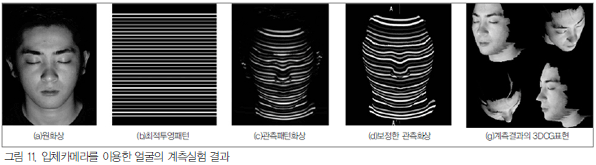 ±×¸² 10Àº °³¹ßÇÑ ÀÔüī¸Þ¶ó(ÀüÀÚµ¿ 3Â÷¿øÈ­»ó °èÃø±â)¸¦ ÀÌ¿ëÇÑ ¾ó±¼ÀÇ 3Â÷¿ø°èÃø ¿¹ÀÌ´Ù. ±×¸²¿¡¼­ ¾Ë ¼ö ÀÖµíÀÌ, Åõ¿µÆÐÅϰú ¹Ý»çÆÐÅÏÀº °°Àº ÁÙ¹«´Ì °­µµÈ­ÀÇ ±ÔÄ¢¼ºÀ» °¡Áö°í ÀÖ´Ù. ÀÌ ±ÔÄ¢¼ºÀ¸·ÎºÎÅÍ ÁÙ¹«´ÌÀÇ ¾îµå·¹½º¸¦ ¿Ã¹Ù¸£°Ô ÃßÁ¤ÇÒ ¼ö ÀÖ¾î ·Î¹ö½ºÆ®ÀûÀÎ 3Â÷¿ø °èÃøÀÌ °¡´ÉÇÏ´Ù. ÀÔüī¸Þ¶ó(ÀüÀÚµ¿ 3Â÷¿øÈ­»ó °èÃø±â)ÀÇ ½Ç¿ë ¿¹·Î½á, ´ÙÀ½°ú °°Àº ºÐ¾ß¸¦ »ý°¢ÇÒ ¼ö ÀÖ´Ù.