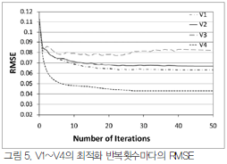 ±×¸² 5´Â °¢ ¹æ¹ýÀÇ ¹Ýº¹È½¼ö¿¡ ´ëÇÑ RMSEÀÇ ÃøÁ¤°á°úÀÌ´Ù. ±×¸² 5¸¦ ÂüÁ¶Çϸé, ¹Ýº¹È½¼ö¿¡ ´ëÇÑ RMSEÀÇ °¨¼Ò°æÇâÀº °¢ ¹æ¹ý ¸ðµÎ °°°í, V1~V4 ¸ðµÎ ¹Ýº¹È½¼ö°¡ 25ȸ¸¦ ÃʰúÇϸé RMSE°¡ °ÅÀÇ ¼ö¼Ó(â¥áÖ)Çϰí ÀÖ´Â °ÍÀ» ¾Ë ¼ö ÀÖ´Ù.