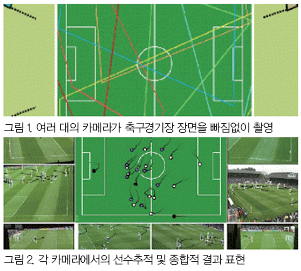 °¢ Ä«¸Þ¶ó¿¡¼ °³º° ¼±¼öµéÀÇ ¿òÁ÷ÀÌ´Â ±ËÀûÀ» ÃßÀûÇÏ¿© ÀÌ¿ô Ä«¸Þ¶ó¿¡ Á¤º¸¸¦ Á¦°øÇÑ´Ù. ÇÑ °æ±â µ¿¾È ¿¬¼ÓÇØ¼ °æ±â³»¿ëÀ» ÃÔ¿µÇÏ¿© ¸ðµç ¼±¼öµéÀÇ °³º°Àû ¿òÁ÷ÀÓ ±ËÀûÀ» ÆÄ¾ÇÇØ ³½´Ù. ÀÌ·¸°Ô ÇÔÀ¸·Î½á °¢ ¼±¼öµéÀÇ ¿îµ¿·®°ú ¿îµ¿ÀÇ È¿À²À» ºÐ¼®ÇÒ ¼ö ÀÖ´Ù. ±×¸² 1Àº ¿îµ¿Àå¿¡ ¿©·¯ ´ëÀÇ Ä«¸Þ¶ó°¡ ¼³Ä¡µÇ¾î ÀÖ´Â °ÍÀ» º¸¿©ÁÖ°í ÀÖ´Ù. ±×¸² 2´Â °¢ Ä«¸Þ¶ó¿¡¼ÀÇ ¼±¼ö ÃßÀû ¹× Á¾ÇÕÀû °á°ú¸¦ º¸¿©ÁÖ°í ÀÖ´Ù. ±×¸² 3Àº ¿òÁ÷ÀÌ´Â °´Ã¼ÀÇ °ËÃâ ¹× ÃßÀû ÈÄ Á¾ÇÕ°á°ú¸¦ ³ªÅ¸³»°í ÀÖ´Ù.