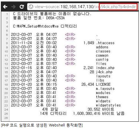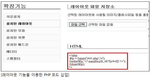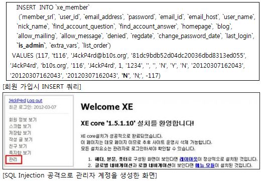 Á¶Á¤Çö ¿¬±¸¿ø¿¡ µû¸£¸é, ÇØ´ç Ãë¾àÁ¡Àº ȸ¿ø°¡ÀÔ ±â´É¿¡¼ SQL InjectionÀÌ °¡´ÉÇØ °ü¸®ÀÚ±ÇÇÑÀÇ °èÁ¤ »ý¼ºÀÌ °¡´ÉÇÑ Ãë¾àÁ¡ÀÌ´Ù. ¶ÇÇÑ °ø°ÝÀÚ´Â ÀÌ·± Ãë¾àÁ¡À» ¾Ç¿ëÇØ ¼¹ö¿¡ SQL Injection °ø°ÝÀ» ½Ãµµ, °ü¸®ÀÚ °èÁ¤ »ý¼º ÈÄ °ü¸®ÀÚ ¸Þ´ºÀÇ ·¹À̾ƿô ±â´É¿¡ PHPÄڵ带 »ðÀÔ¡¤½ÇÇàÇØ ¼¹ö¿¡ Webshell±îÁö »ý¼ºÇÒ ¼ö ÀÖ°Ô µÈ´Ù.