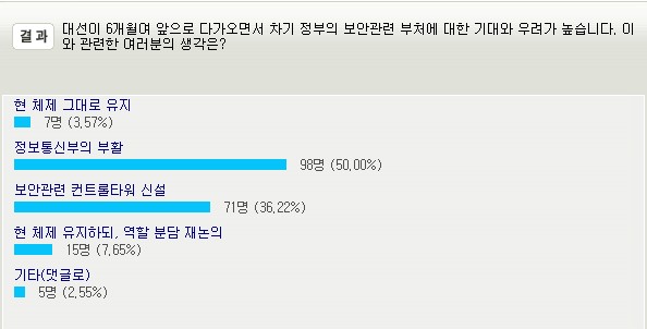 [º¸¾È´º½º ±Ç ÁØ] Â÷±â Á¤ºÎÀÇ º¸¾È°ü·Ã ºÎóÀÇ °æ¿ì ±âÁ¸ Á¤ºÎÁ¶Á÷ ´ë½Å ¡®Á¤º¸Åë½ÅºÎ¡¯¸¦ ºÎȰ½ÃÄÑ À̸¦ ÅëÇØ IT ¹× º¸¾È°ü·Ã ¾÷¹«¸¦ ¼öÇàÅä·Ï ÇÏ±æ ¿øÇÏ´Â »ç¶÷ÀÌ °¡Àå ¸¹Àº °ÍÀ¸·Î ³ªÅ¸³µ´Ù.