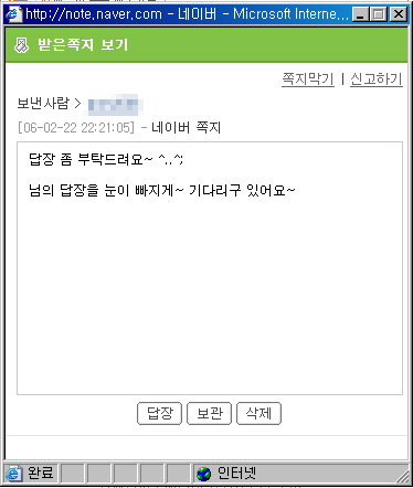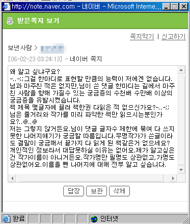 ÀÌ¾î¼ ±×´Â ¡°XXX2006(¾ÆÀ̵ð ÀϺμöÁ¤)Àº ÀüÇô ¸ð¸£´Â ¿©ÀÚ¶óµµ ¾îµò°¡ ¸¸¸¸ÇÒ °Å °°°í È£±â½ÉÀÌ »ý±â¸é ¹«Â÷º°·Î ÂÊÁö¸¦ º¸³»´Â°¡ º»µ¥¿ä, À̳ðÀ¸·ÎºÎÅÍ ÂÊÁö ¹ÞÀ¸¸é ¾î·µç ³×À̹ö¿¡ ½Å°íºÎÅÍ Çϼ¼¿ä. ±×·¯³ª ÂÊÁö¸¦ °ÅÀýÇϰųª ¹«½ÃÇØµµ ¹®Á¦ÀÎ °Ô ³×À̹ö ºí·Î±× ÁÖ¼Ò°¡ ¾ÆÀ̵ð¿Í ¶È°°´Ù´Â Á¡ÀÔ´Ï´Ù. ±×·¡¼ ±× Á¡À» ÀÌ¿ëÇØ¼ ¸î ´Þ¾¿ ²öÁú±â°Ô ºí·Î±×±îÁö ã¾Æ°¡¼ ±× ¿©ÀÚÀÇ ½Å»óÀ» ¾Ë¾Æ³»·Á°í ÇÏ´Â ¾ÇÁúÀÔ´Ï´Ù¡±¶ó´Â ¸»·Î ÇÑ ¾ÆÀ̵𸦠°ø°³ÇÏ¸ç ±×¸¦ ³×À̹öÀÌ¿ëÀڵ鿡°Ô °í¹ß(?)Çϰí ÀÖ´Ù.