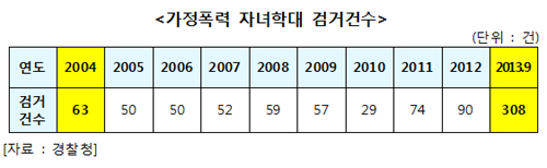 °¡Á¤Æø·Â¿¡ ÀÇÇÑ ÀÚ³àÇÐ´ë °Ë°Å°Ç¼öµµ ³¯·Î Áõ°¡ÇÏ¿© 2004³â 63°ÇÀÌ´ø °ÍÀÌ 2013³â 9¿ù ÇöÀç 308°ÇÀ¸·Î 4.9¹è³ª Áõ°¡Çß´Ù. ¾î¸°À̵éÀÌ °¡Àå ¾ÈÀüÇÑ °÷À̶ó°í ¹Ï´Â °¡Á¤ÀÌ ¿ÀÈ÷·Á ¾î¸°ÀÌÀÇ ¾ÈÀüÀ» À§ÇùÇϰí ÀÖ´Â °ÍÀÌ´Ù.