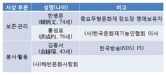 ¹®ÈÀçûÀº ¹®ÈÀ¯»êÀÇ º¸Á¸¡¤°ü¸®, Çмú¡¤¿¬±¸, ºÀ»ç¡¤È°¿ë µî¿¡ °ø·Î°¡ Å« »ç¶÷À» ¼±Á¤ÇÏ¿© ÈÆÀå(¹®ÈÈÆÀå, 2005³âºÎÅÍ ¼ÈÆ)°ú ´ëÅë·É»ó(´ëÇѹα¹¹®ÈÀ¯»ê»ó, 2004³âºÎÅÍ ½Ã»ó)À» ¸Å³â ¹®ÈÀ¯»êÇåÀå Á¦Á¤ÀÏ(12¿ù 8ÀÏ)¿¡ ÁîÀ½ÇÏ¿© ¼ö¿©Çϰí ÀÖ´Ù. ¿ÃÇØ ¼±Á¤µÈ ¹®ÈÈÆÀå ¼ÈÆÀÚ¿Í ´ëÇѹα¹¹®ÈÀ¯»ê»ó ¼ö»óÀÚ´Â ´ÙÀ½°ú °°´Ù.