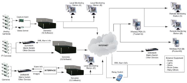±×¸² 2´Â ÀÌ¹Ì ¼³Ä¡µÈ, ȤÀº ½Å±Ô ¾Æ³¯·Î±× Ä«¸Þ¶ó, IP Ä«¸Þ¶ó, DVR·ÎºÎÅÍ ¿µ»ó ¼Ò½º¸¦ ¹Þ¾Æ IQ ¼­¹ö¿¡¼­ ºÐ¼®, ÀúÀåÇÏ°í ¿ø°ÝÁö ¸ð´ÏÅ͸µ°ú PDA µîÀ» ÅëÇÑ °æº¸Á¦¾îÀÇ ±âº» °³³äµµÀÌ´Ù.