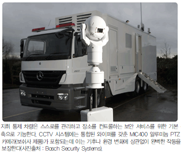 ÁöÈÖ °ü¸® Â÷·®¿¡´Â 12°³ÀÇ ¹«¼± Ä«¸Þ¶ó°¡ ÀÖ°í Â÷·®¿¡¼ 1km±îÁö ¹èÄ¡ÇÒ ¼ö ÀÖ´Ù. ÀÌ Ä«¸Þ¶ó¿¡´Â 2°³ÀÇ MIC400 ¾Ë·ç¹Ì´½ PTZ Ä«¸Þ¶ó°¡ ÀÖ´Ù. ÀÌ Ä«¸Þ¶ó´Â ÅëÇÕµÈ ¿ÍÀÌÆÛ¸¦ °®Ãß°í ÀÖ°í ¿©·¯ Àå¾Ö ¿äÀε鿡 ´ëÇÑ º¸È£¸¦ ±Ø´ëȽÃŰ¸ç ³ôÀº ¼öÁØÀÇ °ø°Ý ¹æÁö ±â´ÉÀ» °®Ãß°í ÀÖ¾î ´Ù¾çÇÑ °ø°ÝÀ» Â÷´ÜÇÒ ¼ö ÀÖ´Ù.