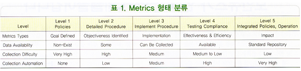 ·¹º§ 1¿¡¼ ·¹º§ 5±îÁö Ư¡À» º¸¸é ·¹º§ 1Àº Á¤Ã¥¸¸ ÀÖ°í, ·¹º§ 2´Â ÀýÂ÷¸¦ ´õ °®Ãß°í, ·¹º§ 3Àº ÀýÂ÷°¡ ½ÃÇè°úÁ¤ÀÌ ÀÌ·ç¾îÁ³´Ù´Â °ÍÀ̸ç, ·¹º§ 5´Â ÅëÇÕµÈ º¸¾ÈÁ¤Ã¥°ú ¿î¿µÀÌ Àß ÀÌ·ïÁö°í ÀÖÀ½À» º¸¿©ÁØ´Ù. ¶ÇÇÑ, À̸¦ ÆÇ´ÜÇϱâ À§ÇÑ µ¥ÀÌÅÍ °¡¿ë¼º, µ¥ÀÌÅÍ ¼öÁý ¾î·Á¿ò, µ¥ÀÌÅÍ ÀÚµ¿¼öÁý µîÀ¸·Î ÀßÇϰí ÀÖ´ÂÁö¸¦ ÆÇ´ÜÇÑ´Ù.