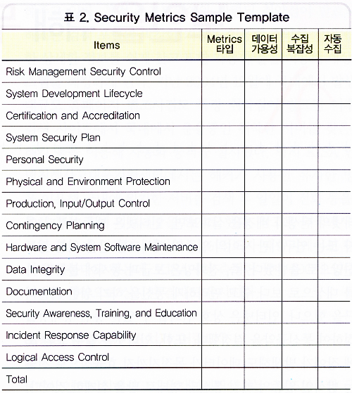 <±×¸² 2>¿Í <Ç¥ 1>À» ¹ÙÅÁÀ¸·Î ´ÙÀ½ <Ç¥ 2>ÀÇ ÅÛÇø´ ³»¿ëÀ» Àû¿ëÇÑ´Ù. °¢ 15°³ Ç׸ñÀº NIST SP-55¿¡ °¢ Ç׸ñ¿¡ ´ëÇÑ ÅÛÇø´ Å×À̺íÀÌ ÀÖÀ¸¹Ç·Î ±×°ÍÀ» ÀÌ¿ëÇϸé Àüü ÅÛÇø´À» ¿Ï¼ºÇÒ ¼ö ÀÖ´Ù. À̸¦ ÅëÇØ Metrics¸¦ ¿Ï¼ºÇϸé ÇöÀç Á¶Á÷ÀÇ º¸¾ÈÇöȲÀÌ ³ªÅ¸³¯ °ÍÀ̸ç, ¹°·Ð ÀÌ·± ¹æ¹ýÀ» ÅëÇØ ¹Ì±¹ ±¹Åä¾Èº¸ºÎµµ ¡®F¡¯ Á¡¼ö¸¦ ¹Þ¾ÒÀ» °ÍÀÌ´Ù. º¸¾È¿¡ ´ëÇÑ Çâ»ó °èȹÀ» ¼ö¸³Çß´Ù¸é Á¤±âÀûÀ¸·Î Metrics¸¦ ¼öÇàÇÏ¸é¼ ÁøÃ´µµ¸¦ È®ÀÎÇÒ ¼ö ÀÖ´Ù.