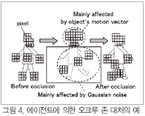 ±×¸² 4´Â ºÎºÐÀûÀÎ ¿ÀÅ©·çÁ¸ ¹ß»ý½Ã¿¡ ¿¡ÀÌÀüÆ®°¡ ÃßÀûÀ» °è¼ÓÇÏ´Â ¸ð½ÀÀ» ¸ð½Äµµ·Î ³ªÅ¸³» º¸ÀÎ ¿¹ÀÌ´Ù. ¿©±â¿¡¼ °¢ ¿¡ÀÌÀüÆ®°¡ ÂüÁ¶ÇÏ´Â ¹üÀ§´Â 3¡¿3 ȼÒÀÇ Å©±âÀÌ´Ù. ¿ÀÅ©·ç Á¸ÀÌ ¹ß»ýÇϱâ Àü¿¡ ¿¡ÀÌÀüÆ®´Â Àι°ÀÇ °¢ ±¹¼Ò¿µ¿ªÀÇ ¿òÁ÷ÀÓ º¤ÅÍ¿¡ µû¶ó¼ À̵¿ÇÑ´Ù. ¿ÀÅ©·ç Á¸ÀÌ ¹ß»ýÇϸé, ¼û¾î ÀÖÁö ¾ÊÀº ¸Ó¸® ºÎºÐ¿¡ ÃßÁ¾Çϰí ÀÖ´ø ¿¡ÀÌÀüÆ®´Â ±×´ë·Î À̵¿ÇÏÁö¸¸, ¼û¾î ÀÖ´Â ºÎÀ§¿¡ ÃßÁ¾Çϰí ÀÖ´ø ¿¡ÀÌÀüÆ®´Â ¿òÁ÷ÀÓ º¤Å͸¦ ÀÒ¾î, ÀÌÀü±îÁöÀÇ ¿òÁ÷ÀÓ º¤ÅÍ¿¡ ÀÇÇÑ °ü¼º ¹× °¡¿ì½º ÀâÀ½¿¡ ÀÇÇÑ ·£´ý ¿öÅ©ÀÇ ¿µÇâÀÌ »ó´ëÀûÀ¸·Î Ä¿Áø´Ù. ¶Ç ¼û¾î ÀÖ´Â ºÎÀ§ ÁÖº¯ÀÇ ¿¡ÀÌÀüÆ®´Â ÀûÇÕµµ°¡ ³·¾ÆÁ® µµÅ嵃 °¡´É¼ºÀÌ ³ô¾ÆÁöÁö¸¸, »çÀü¿¡ ÃæºÐÇÑ ¼öÀÇ ¿¡ÀÌÀüÆ®°¡ ¹ß»ýÇϰí ÀÖ´Ù¸é ¼Ò¼ö´Â »ýÁ¸ÇÑ´Ù.