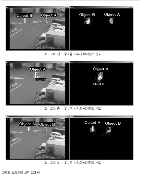 ½ÇÁ¦·Î ±³Â÷°¡ ¹ß»ýÇßÀ» °æ¿ìÀÇ ½ÇÇà ¿¹¸¦ ±×¸² 5¿¡ ³ªÅ¸³½´Ù. ±³Â÷ Á÷Àü±îÁö °¢ ¿¡ÀÌÀüÆ®°¡ ¿ÀºêÁ§Æ®ÀÇ ±¹¼Ò¿µ¿ªÀÇ ¿òÁ÷ÀÓ º¤Åͳª È÷½ºÅä±×·¥ Á¤º¸¸¦ º¸°ü¡¤À¯ÁöÇϰí ÀÖÀ¸¹Ç·Î ±³Â÷ ÈÄ¿¡µµ ¿Ã¹Ù¸£°Ô IDÀÇ ÇÒ´çÀ» °è¼ÓÇÒ ¼ö ÀÖ°Ô µÇ¾î ÀÖ´Ù.