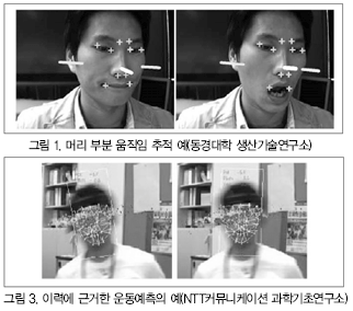 ¸ñ, ÄÚ, ÀÔ µîÀÇ ¾ó±¼ ºÎÀ§°¡ ½Äº° °¡´ÉÇÑ ÇØ»óµµ·Î Àι° ¸Ó¸® ºÎºÐÀÌ °üÂûµÇ´Â °æ¿ì¿¡´Â ¾ó±¼ ºÎÀ§¸¦ Ư¡Á¡À¸·Î ÇÑ ¸ðµ¨ º£À̽ºÀÇ ¹æ¹ýÀ» ÃëÇÏ´Â °æ¿ì°¡ ¸¹´Ù. ¿¹¸¦ µé¾î, ³ôÀº Á¡µéÀº ¸ñ, ÄÚ, ÀÔ µîÀÇ ¾ó±¼ ºÎÀ§°¡ ³¡³ª´Â Á¡À» Ư¡Á¡À¸·Î½á Àι° ¸Ó¸® ºÎºÐÀÇ 3Â÷¿ø À§Ä¡¿Í ÀÚ¼¼(roll, yaw, pitch)¸¦ ÃßÀûÇϰí ÀÖ´Ù. ±×µéÀÇ ¹æ¹ý¿¡¼´Â ´õ¿íÀÌ ÀÔÀ» ¿°Å³ª ¹Ì°£À» ÂîǪ¸®°Å³ª ÇÏ´Â ¾ó±¼ÀÇ º¯ÇüÀ» ¸ðµ¨ÈÇÔÀ¸·Î½á ÀÚ¼¼ÀÇ º¯µ¿»Ó¸¸ ¾Æ´Ï¶ó, Ç¥Á¤ÀÇ º¯È¿¡ ´ëÇØ¼µµ Á¤¹ÐÇÑ ÃßÀûÀ» ½ÇÇöÇϰí ÀÖ´Ù(±×¸² 1).