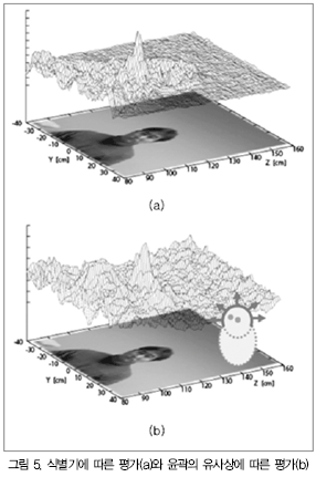 ±×·¡¼ ÀúÀÚµéÀº ÆÄƼŬ ÇÊÅÍÀÇ Æ²¿¡¼ AdaBoost ½Äº°±â¸¦ ÀÌ¿ëÇØ »ùÇÃÀ» Æò°¡ÇÔÀ¸·Î½á ÃßÀûÀ» ½Ç½ÃÇÏ´Â ¹æ¹ýÀ» °í¾ÈÇß´Ù. ±×¸² 4¿¡ ³ªÅ¸³»µíÀÌ °¡Àå ±âº»ÀûÀÎ AdaBoost ÇнÀ¿¡ ÀÇÇÑ ¾ó±¼ ½Äº°±â¿¡¼´Â ¿©·¯ ½Äº°±âÀÇ Ãâ·ÂÀÇ °¡Áßȸ¦ °è»êÇØ ±× °á°ú¸¦ ÇѰèÁ¡À¸·Î ºÐ·ùÇÏ´Â °ÍÀ¸·Î ¾ó±¼ÀÎÁö ¾Æ´ÑÁö¸¦ ÆÇÁ¤ÇÑ´Ù. ÀÌ ¹æ¹ý¿¡¼´Â ÀÌ ÇѰèÁ¡À¸·Î ºÐ·ùÇϱâ ÀüÀÇ ¼öÄ¡¸¦ »ùÇÃÀÇ Æò°¡Ä¡·Î½á ÀÌ¿ëÇÏ´Â °ÍÀ» »ý°¢ÇÑ´Ù. Àι°ÀÇ ¸Ó¸® ºÎºÐ ÁÖº¯¿¡¼ÀÇ Æò°¡Ä¡ÀÇ ºÐÆ÷¸¦ °èÃøÇÑ °ÍÀÌ ±×¸² 5(a)ÀÌ´Ù. Àι°ÀÇ ¸Ó¸® ºÎºÐ Á᫐ ºÎ±Ù¿¡¼´Â ³ôÀº ¼öÄ¡°¡ µÇ°í ¸Ö¾îÁö¸é ³·Àº ¼öÄ¡°¡ µÇ´Â °ÍÀ» ¾Ë ¼ö ÀÖ´Ù. ±×¸² 5(b)´Â À±°ûÀÇ À¯»ç¼º¿¡ ÀÇÇÑ Æò°¡Ä¡ÀÇ ºÐÆ÷ÀÌÁö¸¸ ÀÌ¿¡ ºñÇØ ½Äº°±â¿¡ ÀÇÇÑ Æò°¡(±×¸² 5(a))´Â Àι° ¸Ó¸® ºÎºÐ Á᫐ ºÎ±Ù¸¸ Æò°¡Ä¡°¡ ³ô°í ±× ¿Ü¿¡¼´Â ¶È°°ÀÌ ³·¾ÆÁö°í ÀÖ¾î Á¤È®µµ ³ôÀº Æò°¡°¡ °¡´ÉÇÏ´Ù´Â °ÍÀ» ¾Ë ¼ö ÀÖ´Ù.