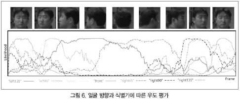 ±×·¯³ª Àι° ¸Ó¸® ºÎºÐ¿¡¼´Â ¹æÇâ¿¡ µû¶ó ±× ¿Ü°üÀÌ ´Ù¸£¸ç ¶Ç Àι°Àº ¹Ýµå½Ã Ä«¸Þ¶ó¿¡ ´ëÇØ ÀÏÁ¤ ¹æÇâÀ» ÇâÇϰí ÀÖ´Â °ÍÀº ¾Æ´Ï±â ¶§¹®¿¡ ÇϳªÀÇ ½Äº°±â¿¡¼´Â ¸Ó¸® ºÎºÐÀÇ ¹æÇâÀÌ ¹Ù²î¾úÀ» °æ¿ì¿¡ ´ëÀÀÇÒ ¼ö ¾ø´Ù. ±×·¡¼ ÀÌ ¼ö¹ý¿¡¼´Â 7¹æÇâÀÇ Àι° ¸Ó¸® ºÎºÐÀ» ½Äº°ÇÏ´Â ½Äº°±â±ºÀ» ÁغñÇÏ°í ±×°ÍµéÀ» ¼±ÅÃÀûÀ¸·Î ÀÌ¿ëÇÑ´Ù. Áï, »ùÇÃÀÇ »óÅ·®¿¡´Â ¸Ó¸® ºÎºÐÀÇ À§Ä¡¸¸ÀÌ ¾Æ´Ï¶ó ¸Ó¸® ¹æÇâÀÇ Á¤º¸µµ °¡Áö°Ô ÇØ Ä«¸Þ¶ó¿ÍÀÇ »ó´ëÀûÀÎ À§Ä¡ °ü°è¿¡ ±Ù°ÅÇØ ½Äº°±â¸¦ ¼±Åà ÀÛ¿ëÇÔÀ¸·Î½á ¿îµ¿ ¸ðµ¨¿¡ ÀÇÇØ ¿¹ÃøµÈ °¢ »ùÇÃÀÇ ¿ìµµ(éÖÓø) Æò°¡¸¦ °¡´ÉÇÏ°Ô ÇÑ´Ù. »ó´ëÀûÀÎ ¸Ó¸® ºÎºÐÀÇ ¹æÇâ°ú °¢ ¹æÇâÀÇ ½Äº°±â Æò°¡Ä¡ÀÇ °ü°è¸¦ ±×¸² 6¿¡ ³ªÅ¸³Â´Ù. ±×¸² 6Àº ¸Ó¸® ºÎºÐÀÇ È¸Àü¿¡ µû¶ó °¢ ½Äº°±â Æò°¡Ä¡°¡ ¾î¶² ½ÄÀ¸·Î º¯ÈÇÏ´ÂÁö¸¦ ³ªÅ¸³½ °ÍÀÌ´Ù. Àι°Àº Ä«¸Þ¶ó¿¡¼ ºÃÀ» ¶§ »óºÎÀÇ »çÁø°ú °°ÀÌ Ã³À½¿¡´Â Á¤¸éÀ» ÇâÇϰí ÀÖ°í ÇÁ·¹ÀÓÀÌ ÁøÇàµÊ¿¡ µû¶ó¼ ¼¼È÷ ¿ÞÂÊ¿¡¼ µÚ¸¦ ÇâÇØ ¸¶Áö¸·¿¡´Â ÇÑ ¹ÙÄû µ¹¾Æ ´Ù½Ã Á¤¸éÀ» ÇâÇÑ »óŰ¡ µÈ´Ù.