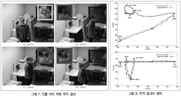 ±×¸² 7·ÎºÎÅÍ °ÅÀÇ Á¤È®ÇÏ°Ô Àι° ¸Ó¸® ºÎºÐÀÇ Áß½ÉÀ» ÃßÀûÇϰí ÀÖ´Ù´Â °ÍÀ» ¾Ë ¼ö ÀÖ´Ù. ¶Ç ÇÑ ¸íÀÇ Àι° ¸Ó¸®¸¦ ÃßÀûÇßÀ» °æ¿ì 󸮴 ÇÕ°è 30ms Á¤µµ·Î ¿Ï·áÇÒ ¼ö ÀÖ¾î ºñµð¿À ÇÁ·¹ÀÓ ·¹ÀÌÆ®¿¡¼ÀÇ ÃßÀûÀÌ °¡´ÉÇÏ´Ù. ¶ÇÇÑ, ÃßÀû Á¤È®µµ¸¦ Á¤·®ÀûÀ¸·Î Á¶»çÇϱâ À§Çؼ ¼öÀÛ¾÷À¸·Î ¾òÀº ¸Ó¸® ºÎºÐ À§Ä¡¿Í ÃßÀû °á°úÀÇ ±ËÀûÀ» ±×¸² 8¿¡ ³ªÅ¸³½´Ù. Æò±Õ ¿ÀÂ÷´Â 2cm ÀÌÇÏÀ̸ç Á¤È®ÇÑ ÃßÀûÀ» ½ÇÇöÇÒ ¼ö ÀÖ¾ú´Ù.