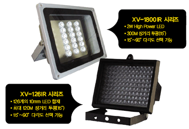 XV-126IRÀº 10mmÀÇ LED 126°³¸¦ žÀçÇÏ¿© ¼¶¼¼ÇÑ Åõ±¤ ¹× ÃÖ´ë 120m±îÁö Åõ±¤ÀÌ °¡´ÉÇÏ¸ç ¹«°Ô ¶ÇÇÑ 1Kg ¹Û¿¡ µÇÁö ¾Ê¾Æ ¼³Ä¡°¡ ¿ëÀÌÇÏ´Ù. µÎ Á¦Ç° ¸ðµÎ 15¡Æ, 30¡Æ, 45¡Æ, 60¡Æµî ´Ù¾çÇÑ °¢µµÀÇ Á¦Ç°ÀÌ ÀÖ¾î Ä«¸Þ¶ó ¹× ÇöÀå¿¡ ¸Â°Ô ±Ù¡¤Àå°Å¸® Á¶ÇÕÀÌ °¡´ÉÇÏ´Ù.