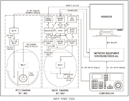 ¶ÇÇÑ, °¢°¢ÀÇ M.F.P Ä«¸Þ¶óµé »çÀÌ¿¡¼µµ Åë½ÅÀÌ °¡´ÉÇÏ´Ù. Áï, M.F.P Ä«¸Þ¶ó´Â ¶Ç ´Ù¸¥ M.F.P Ä«¸Þ¶ó¿¡°Ô Á¤º¸¸¦ º¸³»¾î ¿òÁ÷ÀÌ´Â »ç¹°ÀÌ Ä«¸Þ¶óÀÇ È°¢¿¡¼ ¹þ¾î³ª´õ¶óµµ »ç¹°¿¡ ´ëÇÑ µ¿¼± ÃßÀûÀÌ ²÷ÀÓ¾øÀÌ °¡´ÉÇÑ ¿¬°èÃßÀû ½Ã½ºÅÛÀ» ±¸¼ºÇÒ ¼ö ÀÖ´Ù. °Ô´Ù°¡ ¾Õ¼ »ìÆìº» ½Ã½ºÅÛµéó·³ º°µµÀÇ S/W¸¦ »ç¿ëÇÑ ¼¹ö¸¦ ±¸ÃàÇÏÁö ¾Ê¾Æµµ Ä«¸Þ¶ó¿¡¼ ¸ðµç ±â´ÉÀ» ¼öÇàÇϸç, º°µµÀÇ HDD¸¦ »ðÀÔÇÏ¿© Ä«¸Þ¶ó ÀÚü¿¡¼µµ À̺¥Æ®¸¦ ÀúÀåÇÒ ¼ö ÀÖ´Ù. µû¶ó¼ ½Ç½Ã°£ °¨½Ã¿µ»óÀÌ ´Ù¼Ò Áö¿¬µÇ¾î º¸ÀÏ ¼ö ÀÖ´Ù´Â ¹®Á¦Á¡°ú ½Ã½ºÅÛ ±¸Ãà ½Ã °ø°£ÀÇ Á¦¾àÀÌ »ý±â´Â ¹®Á¦Á¡ µîÀ» °³¼±Çß°í, ¼¾ÅÍ¿Í ·ÎÄÃÀÇ ÀÌÁß µ¥ÀÌÅÍ º¸°üÀ¸·Î µ¥ÀÌÅÍ º¸¾Èµµ ´õ¿í °·ÂÇØÁ³´Ù.