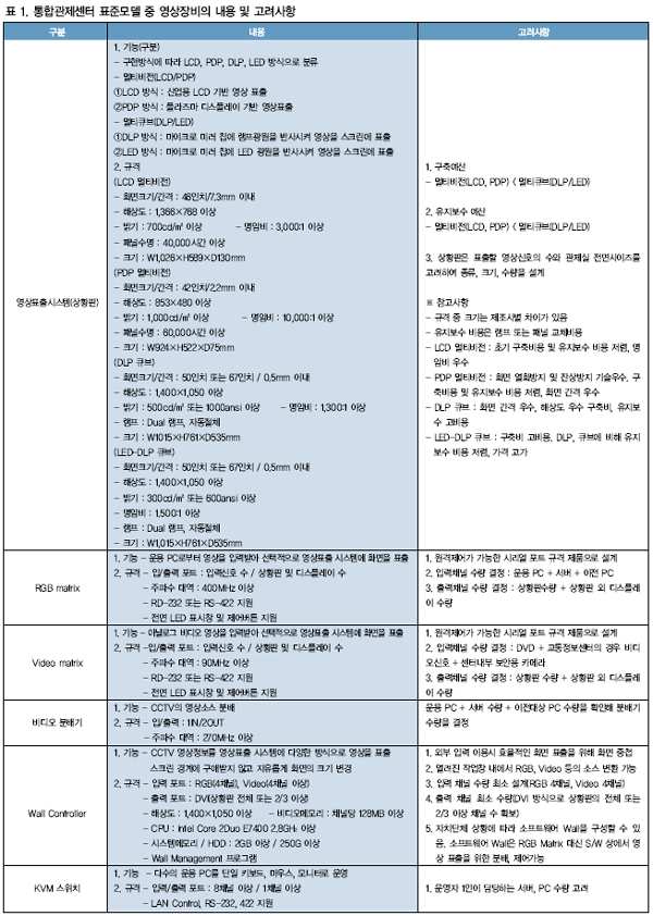 ÅëÇÕ°üÁ¦¼¾Å͸¦ ±¸ÃàÇÏ¸é¼ °¡Àå ¾Ö¸¦ ¸Ô´Â ºÎºÐÀÌ ¹Ù·Î Çϵå¿þ¾î ±¸¼ºÀÌ´Ù. ÅëÇÕ°üÁ¦¼¾ÅÍÀÇ Çϵå¿þ¾î´Â CCTV ¿µ»óÁ¤º¸ÀÇ ¼öÁý, ÅëÇÕ, °¡°ø, Á¦°ø ¹× °ü¸®¸¦ À§ÇÑ ½Ã½ºÅÛÀ¸·Î ±âÁ¸ÀÇ °üÁ¦ ½Ã½ºÅÛ°ú´Â Â÷À̰¡ Ä¿ ´ã´çÀÚ°¡ Á¦ÀÏ ¾î·Á¿òÀ» Åä·ÎÇÏ´Â ºÎºÐÀ̱⵵ ÇÏ´Ù. ÅëÇÕ°üÁ¦¼¾ÅÍÀÇ Çϵå¿þ¾î´Â ¿µ»óÀåºñ, À½ÇâÀåºñ, ¼¹ö, ¿î¿ë PC, ½ºÅ丮Áö, ³×Æ®¿öÅ©, º¸¾È ½Ã½ºÅÛ µîÀ¸·Î ÀÌ·ïÁö´Â µ¥ ±× Áß¿¡¼ ¿µ»óÀåºñ ±¸Ãà¿¡ ´ëÇØ ¾Ë¾Æº¸ÀÚ. ¿µ»óÀåºñ´Â CCTV ¿µ»óÀ» ÅëÇÕ°üÁ¦¼¾ÅÍ Àü¸é¿¡ Ç¥ÃâÇϱâ À§ÇÑ ±â´ÉÀ» °¡Áø Àåºñ´Ù. ¿µ»ó Ç¥Ãâ½Ã½ºÅÛ, RGB matrix, Video matrix, Wall Controller µîÀ¸·Î ±¸¼ºµÇ¸ç ½Ã½ºÅÛ »óȲ¿¡ µû¶ó ¼ÒÇÁÆ®¿þ¾î WallÀ» »ç¿ëÇØ ±¸¼ºµÈ´Ù. º¸´Ù ÀÚ¼¼ÇÑ »çÇ×Àº Ç¥ 1À» ÂüÁ¶ÇÏ¸é µÈ´Ù.
