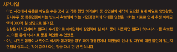 ±×·¯³ª ÀÌ·¸µí ´ë´ãÇÑ ±â¼úÀ¯Ãâ Çà°¢Àº B»çÀÇ Á÷¿øµéÀÌ ¿¬¼ÓÀûÀ¸·Î Åð»çÇϰí, ÄÄÇ»ÅÍ ¹× ¿ÜÀå Çϵåµð½ºÅ©¿¡ ÀúÀåµÇ¾î ÀÖ´ø °¢Á¾ ÆÄÀÏÀÌ »èÁ¦µÇ¾î ´ç½Ã ¼öÇà ÁßÀÌ´ø 4´ë° »ì¸®±â »ç¾÷ °ø»ç¿¡ ¸·´ëÇÑ Â÷ÁúÀÌ ºú¾îÁö°Ô µÇ¸é¼ ¾Ë·ÁÁö°Ô µÆ°í, °á±¹ °æÂûÀÇ ¼ö»ç·Î ±× Àü¸ð°¡ µå·¯³µ´Ù.