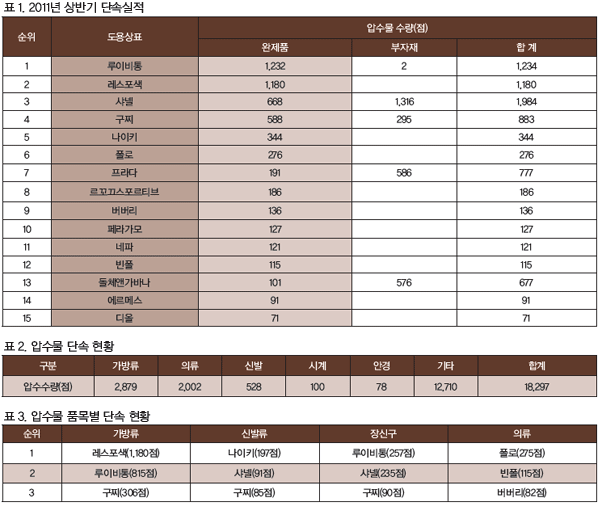 »ó¹Ý±â Àû¹ßµÈ À§Á¶»óǰ Áß °¡Àå ¸¹Àº Á¦Ç°Àº ÇÁ¶û½º ¸íǰ ºê·£µåÀÎ ¡®·çÀ̺ñÅë(1,232Á¡)¡¯À̸ç, ·¹½ºÆ÷»ö(1,180Á¡), »þ³Ú(668Á¡), ±¸Âî(588Á¡), ³ªÀÌŰ(344Á¡) ¼øÀ¸·Î ´Ü¼ÓµÆ´Ù. ¾Ð¼ö¹°Ç°Àº À¯¸í ºê·£µå »óǰÀ» ¸ð¹æÇÑ °¡¹æ¡¤ÀÇ·ù¡¤½Å¹ß·ù°¡ ´ëºÎºÐÀ̸ç, Á¤Ç° ½Ã°¡·Î ȯ»êÇÏ¸é ¾à 120¾ï ¿øÀÌ ³Ñ´Â ¾×¼öÀÌ´Ù.