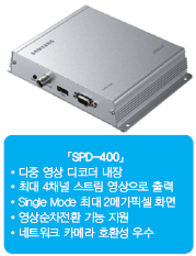 µðÁöÅÐ ½ÃÅ¥¸®Æ¼ ±Û·Î¹ú ¸®´õ »ï¼ºÅ×Å©À©(070-7147-8771~8)Àº H.264 ³×Æ®¿öÅ© ºñµð¿À µðÄÚ´õ ¡¸SPD-400¡¹À» 8¿ù¿¡ Ãâ½ÃÇÑ´Ù. SPD-400Àº H.264/MPEG-4/MJPEGÀÇ ´ÙÁß ¿µ»ó µðÄÚ´õ¸¦ ³»ÀåÇØ ³×Æ®¿öÅ©·Î Àü¼ÛµÇ´Â ÃÖ´ë 4ä³Î ½ºÆ®¸²À» HDMI¿Í VGA, CVBS ¿µ»óÀ¸·Î Ãâ·ÂÇÑ´Ù. SPD-400Àº Single Mode¿¡¼ ÃÖ´ë 2¸Þ°¡Çȼ¿ÀÇ °íÇØ»óµµ ȸéÀ», Quad ¸ðµå¿¡¼´Â 720p 4ä³ÎÀÇ È¸é±îÁö Áö¿øÇÑ´Ù. ¶ÇÇÑ, »ç¿ëÀÚ°¡ ¿©·¯ ä³ÎÀÇ È¸éÀ» ¹ø°¥¾Æ ¸ð´ÏÅ͸µ ÇÒ ¼ö ÀÖ´Â ¿µ»ó¼øÂ÷Àüȯ ±â´Éµµ Á¦°øÇÑ´Ù.