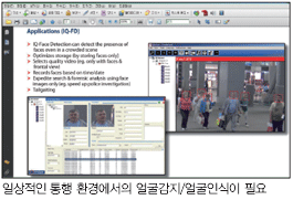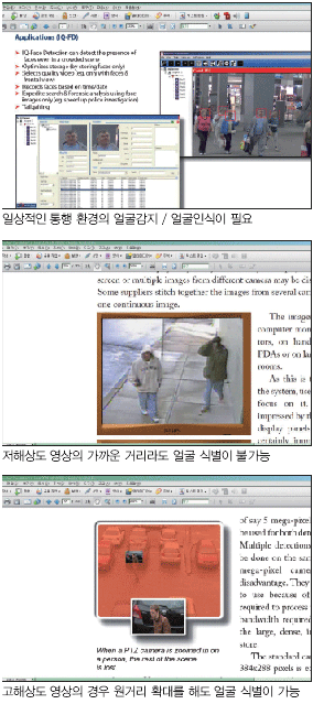 µÑ°, ±â¼úÀûÀÎ Ãø¸é¿¡ ÀÖ¾î¼ ÇöÀç Áö´ÉÇü ¿µ»óºÐ¼®±â¼úÀº ¾ó±¼°¨Áö(Face Detection) ±â´É°ú °¨ÁöµÈ ¾ó±¼»çÁøÀ» ºÐ¼®ÇØ ´©±¸ÀÎÁö ÆÄ¾ÇÇÏ´Â ¾ó±¼ÀνÄ(Face Recognition) ¼Ö·ç¼ÇÀ¸·Î ³ª´ ¼ö ÀÖ´Ù. ¾ó±¼°¨Áö´Â Ä«¸Þ¶ó ÇØ»óµµ¿¡ µû¶ó ´Ù¸£Áö¸¸ 2~20m °Å¸®¿¡¼ Áö³ª°¡´Â »ç¶÷ÀÇ ¾ó±¼¸¸À» °¨ÁöÇØ ÀúÀåÇÏ´Â ±â´ÉÀ̰í, µû·Î ÀνÄÀº ÇÏÁö ¾Ê´Â ±â´ÉÀÌ´Ù. ±×·¯¹Ç·Î ÅëÇàÀÎÀÇ ¾ó±¼ TÁ¸À» °¨ÁöÇÒ ¼ö ÀÖ´Â ÃæºÐÇÑ Çȼ¿ÀÇ ¿µ»ó ¼Ò½º¸¸ ÀÖ´Ù¸é °¨ÁöµÈ ¾ó±¼¿¡ »ç°¢Çü ¹Ú½º¸¦ ó¸®Çϵç, ¸ðÀÚÀÌÅ© 󸮸¦ ÇÏµç ¾î·Á¿î ÀÏÀº ¾Æ´Ï´Ù. ¾ó±¼ÀνÄÀº ±×·¸°Ô °¨ÁöµÈ ¾ó±¼À» ÀúÀåµÈ µ¥ÀÌÅͺ£À̽º¿¡¼ °Ë»öÇØ¼ ´©±¸ÀÎÁö ¾Ë·ÁÁÖ´Â °ÍÀÌ´Ù. ¾ó±¼ÀνÄÀº Åë»ó 30cm ~2m ³»¿ÜÀÇ ÀÎ½Ä °Å¸®, D1±Þ Ä«¸Þ¶ó ³»Áö ±× ÀÌ»óÀÇ °íÇØ»óµµ(Mega-Pixel) Ä«¸Þ¶ó¸¦ ÇÊ¿ä·Î ÇÑ´Ù. ¾ó±¼°¨Áöµµ »ç¶÷ÀÇ Çüü¸¦ ¸ÕÀú ¾Ë¾Æº» ÈÄ ±× Áß¿¡¼ ¾ó±¼¸¸À» ÃßÃâÇØ ³»¾ß ÇϹǷΠ¿µ»óºÐ¼® ¼¹öÀÇ CPU ¼Ò¸ð°¡ ¸¹Áö¸¸, ¾ó±¼ÀνÄÀº »çÀü¿¡ ÀÔ·ÂµÈ dBase¿Í ºñ±³¸¦ ÇØ¾ß Çϱ⿡ ´õ ¸¹Àº ½Ã°£ÀÌ ¼Ò¿äµÇ¸ç CPU ¼Ò¸ð ¿ª½Ã Å©´Ù.