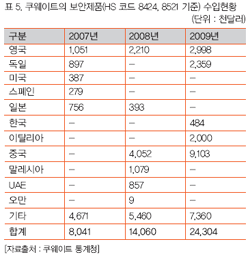 Äí¿þÀÌÆ®ÀÇ °æ¿ì Ưº°ÇÑ ¼öÀÔ±ÔÁ¦´Â ¾øÀ¸¸ç, ´Ù¸¸ ¹Ì±¹, ¿µ±¹, µ¶ÀÏ, ÀϺ» µî ¼±Áø±¹ÀÇ ÀÎÁõ Ãëµæ Á¦Ç°À» ¼±È£ÇÏ´Â °æÇâÀÌ ÀÖ´Ù. ¼öÀÔ °ü¼¼´Â 5%À̸ç, ´Ù¸¥ ºÎ°ú ¼¼±ÝÀº ¾ø´Ù. Çѱ¹±â¾÷ÀÌ º¸¾È¡¤ÈÀç Àåºñ ¼öÃâÀ» È®´ëÇϱâ À§Çؼ´Â ÈÀ硤º¸¾È °ü·ÃÇÑ ÇöÁöÀÇ À¯·Â ¿¡ÀÌÀüÆ®¸¦ ¹ß±¼ÇÏ´Â ÀÏÀÌ ¸Å¿ì Áß¿äÇÏ´Ù. ¿Ü±¹±â¾÷Àº ¹Ýµå½Ã Äí¿þÀÌÆ® ¿¡ÀÌÀüÆ®¸¦ µÖ¾ß ÇÏ´Â °ü°è·Î À¯·Â ¿¡ÀÌÀüÆ® ¹ß±¼ÀÌ »ç¾÷ ¼º°øÀÇ Áö¸§±æÀÎ °ÍÀÌ´Ù.