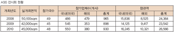 57ȸ°¸¦ ¸Â´Â ¿ÃÇØ ASIS 2011 Àü½Ãȸ´Â Àü ¼¼°è 104°³±¹ 2¸¸¿© ¸íÀÌ ³Ñ´Â Âü°ü°´ÀÌ ÀÔÀåÇßÀ¸¸ç, 23¸¸ ½ºÄù¾îÇÇÆ®(sqft)ÀÇ Å©±â¸¦ ÀÚ¶ûÇÏ´Â ¿À·»Áö ÄÁÆ®¸® ÄÁº¥¼Ç ¼¾ÅÍ¿¡¼ 731°³ ¾÷ü°¡ ºÎ½º¸¦ °¡Áö°í Âü°¡ÇØ ¹Ì±¹ÀÇ º¸¾È ¼Ö·ç¼Ç ½ÃÀåÀ» ÇÑ ´«¿¡ º¸¿©ÁÖ´Â ÀÚ¸®°¡ µÆ´Ù.