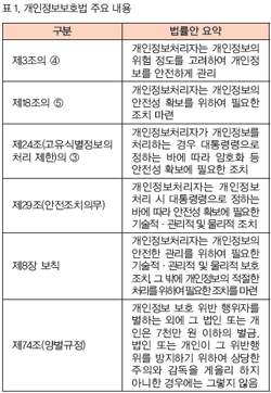 À§ Ç¥1, Ç¥2ÀÇ ³»¿ëÀ» ¿ä¾àÇϸé, °³ÀÎÁ¤º¸´Â Ãë±ÞÀ» Çã°¡ ¹ÞÀº °³ÀÎÁ¤º¸ Ãë±ÞÀÚ³ª ³»ºÎÀÚ¿¡ ÀÇÇØ¼ Á¦ÇÑÀûÀ¸·Î 󸮵Ǿî¾ß Çϸç, °³ÀÎÁ¤º¸ÀÇ Ãë±Þ ±ÇÇÑÀÌ ¾ø´Â »ç¶÷ÀÌ °³ÀÎÁ¤º¸¸¦ Ãë±ÞÇϰųª, °³ÀÎÁ¤º¸ ó¸® ±ÇÇÑÀÌ ¾ø´Â »ç¶÷¿¡°Ô °³ÀÎÁ¤º¸¸¦ Á¦°øÇÏ´Â °ÍÀ» ±ÝÁöÇÏ´Â °ÍÀÌ´Ù. Áï, °³ÀÎÁ¤º¸¸¦ ¾ÏÈ£ÈÇϰí, ±ÇÇÑÅëÁ¦¸¦ ÅëÇØ ³»ºÎ »ç¿ëÀÚ Á¢±ÙÁ¦¾î ¹× ¿ÜºÎÀ¯ÃâÀ» Â÷´ÜÇ϶ó´Â ³»¿ëÀÌ´Ù.
