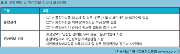 ÅëÇÕ°üÁ¦¼¾ÅÍ´Â ¿µ»óÁ¤º¸ÀÇ ÅëÇÕ°ü¸®¿Í Ãë±Þ¿¡ ´ëÇÑ °³ÀÎÁ¤º¸º¸È£ ¹®Á¦¸¦ ¹Ýµå½Ã °í·ÁÇØ¾ß Çϸç, °í·Á»çÇ×Àº Ç¥ 8°ú °°´Ù.