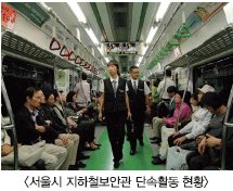 ÇÑÆí, 2ÁÖ°£ÀÇ ±³À°°ú ½Ç½ÀÀ» °ÅÃÄ º»°ÝÀûÀΠȰµ¿¿¡ µé¾î°¡´Â ÁöÇÏöº¸¾È°üÀº ÇöÀç ÃÑ 75¸íÀ̸ç, 1~8È£¼±¿¡¼ 2ÀÎ1Á¶·Î ¿ÀÀü 7½ÃºÎÅÍ ¸·Â÷¿îÇà Á¾·á ½Ã°£ÀÎ »õº® 1½Ã±îÁö 2±³´ë·Î Ȱµ¿Çϰí ÀÖ´Ù. ÁöÇÏöº¸¾È°üÀº ÃÖ±Ù ºó¹ßÇÏ´Â ÁöÇÏö ³» ¼ºÃßÇà°ú °¢Á¾ ¹üÁËÇàÀ§¸¦ »çÀü¿¡ ¿¹¹æÇÏ°í ½Ã¹ÎÀÌ ¾È½ÉÇϰí ÀÌ¿ëÇÒ ¼ö ÀÖ´Â ¾ÈÀüÇÑ ÁöÇÏöÀ» ¸¸µé±â À§ÇÑ ¡®½Ã¹ÎºÒÆíºÒ¾È ¿äÀÎ ÇØ¼Ò´ëÃ¥¡¯ÀÇ ÀÏȯÀ¸·Î ½ÃÀ۵ƴÙ. ¼¿ï¸ÞÆ®·Î(1~4È£¼±)¿¡¼ 40¸í, ¼¿ïµµ½Ãöµµ°ø»ç(5~8È£¼±)¿¡¼ 35¸íÀ» ä¿ëÇØ ÃÑ 75¸íÀÇ º¸¾È°üÀÌ È°µ¿ Áß¿¡ ÀÖ´Ù. ´Ü, ¹Î°£ÀÌ ¿î¿µÇÏ´Â 9È£¼±Àº ¾ÈÀü¿ä¿ø 21¸íÀÌ º°µµ·Î ¹èÄ¡µÅÀÖ´Ù.