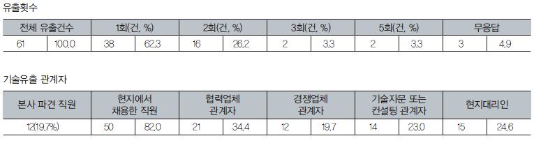 À¯Ãâ °ü°èÀÚ´Â ÇöÁöä¿ë Á÷¿øÀÌ 50°³ »ç(82.0%)·Î ¾ÐµµÀûÀ¸·Î ³ô¾ÒÀ¸¸ç, Çù·Â¾÷ü °ü°èÀÚ 21°³ »ç(34.4%), ÇöÁö ´ë¸®ÀÎ 15°³ »ç(24.6%), ±â¼úÀÚ¹® ¶Ç´Â ÄÁ¼³ÆÃ °ü°èÀÚ 14°³ »ç(23.0%), °æÀï¾÷ü °ü°èÀÚ 12°³ »ç(19.7%), º»»ç ÆÄ°ß Á÷¿ø 12°³ »ç(19.7%) ¼øÀ¸·Î ³ªÅ¸³µ´Ù.
