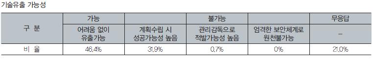 ±â¼úÀ¯Ãâ Á¤º¸¿Í °¡´É¼º¿¡ ´ëÇÑ Á¶»ç³»¿ë Áß ÀÀ´ä±â¾÷ÀÇ 56.5%°¡ ¿ÜºÎ·Î À¯ÃâµÇ¾úÀ» ¶§ ÇÇÇØ°¡ ¿¹»óµÇ´Â Áß¿äÁ¤º¸¸¦ º¸À¯Çϰí ÀÖ´Â °ÍÀ¸·Î ³ªÅ¸³µ´Ù. ¶ÇÇÑ, ³»ºÎ ±â¹ÐÁ¤º¸ÀÇ ¿ÜºÎÀ¯Ãâ À§Çù¿¡ ´ëÇØ¼­´Â ÀÀ´ä±â¾÷ÀÇ 42%°¡ ½É°¢ÇÏ´Ù°í ÀÀ´äÇßÀ¸¸ç, 19.6%´Â º¸Åë, 34.7%´Â À§ÇùÀÌ ¾ø´Ù°í ´ë´äÇß´Ù.