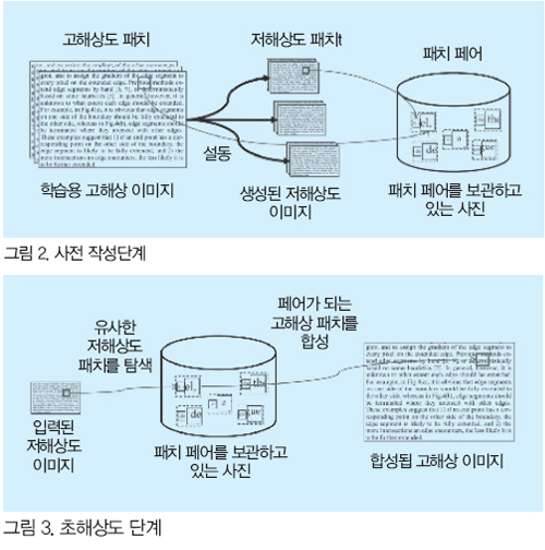 Á¦¾È¹æ¹ýÀº °íÇØ»óµµ À̹ÌÁö¿Í ÀúÇØ»óµµ À̹ÌÁö·ÎºÎÅÍ Àß¶ó ³½ ÆÐÄ¡ÀÇ Æä¾î¸¦ ÇнÀ µ¥ÀÌÅÍ·Î »çÀü¿¡ º¸°üÇÏ´Â »çÀü ÀÛ¼º´Ü°è¿Í »çÀüÀ¸·ÎºÎÅÍ ÀÔ·Â À̹ÌÁö¿¡ ÀûÇÕÇÑ ÆÐÄ¡¸¦ Ž»öÇØ °íÇØ»óµµ À̹ÌÁö¸¦ ÇÕ¼ºÇÏ´Â ÃÊÇØ»óµµ´Ü°è·Î ÀÌ·ïÁø´Ù. ¹æ¹ý¿¡ ´ëÇÑ »ó¼¼ÇÑ ³»¿ëÀº Âü°í¹®Çå4)À» ÅëÇØ »ìÆìº¼ ¼ö ÀÖ´Ù.