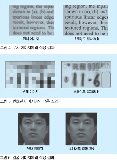 ´ÙÀ½À¸·Î ÀÚµ¿Â÷ ¹øÈ£ÆÇ¿¡ Àû¿ëÇÑ °á°ú¸¦ º¼ ¼ö ÀÖ´Ù. ÇнÀ¿ëÀÇ °íÇØ»óµµ À̹ÌÁö·Î¼ 2,000ÀåÀÇ ¹øÈ£ÆÇ À̹ÌÁö(Å©±â ÅëÀÏ)¸¦ »ç¿ëÇßÀ¸¸ç ½ÇÇè¿¡ »ç¿ëÇÑ ÀúÇØ»óµµ À̹ÌÁö´Â µðÁöÅÐÄ«¸Þ¶ó·Î ¿ø°Å¸®¿¡¼ ÃÔ¿µÇÑ °ÍÀÌ´Ù. Á¦¾È¹æ¹ý¿¡ ÀÇÇØ 8¹è ÃÊÇØ»óµµ¸¦ ½Ç½ÃÇÑ °á°ú¸¦ ±×¸² 5¿¡ ³ªÅ¸³Â´Ù. ¿ø·¡ À̹ÌÁö´Â 13¡¿7ȼҹۿ¡ ¾È µÇÁö¸¸ ÀÚµ¿Â÷ ¹øÈ£ÆÇÀ̶ó´Â Áö½ÄÀ» »çÀüÀ¸·Î Ȱ¿ëÇÔÀ¸·Î½á 4ÀÚ¸® ¼ýÀںκп¡ ´ëÇØ¼´Â Á¤È®ÇÏ°Ô º¹¿øµÆ´Ù.