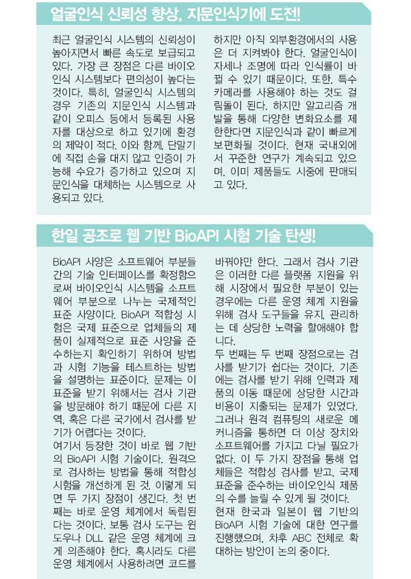 ¹ÙÀÌ¿ÀÀÎ½Ä ±¹Á¦Ç¥Áرⱸ ISO/IEC JTC1 SC37ÀÌ µîÀåÇÑ °Íµµ À̶§ºÎÅÍ¿´´Ù. ¹°·Ð, ±¹Á¦Ç¥ÁØÀÌ µîÀåÇÑ °ÍÀº ¹ÙÀÌ¿ÀÀÎ½Ä »ê¾÷ÀÇ ¹ßÀü¿¡ µû¶ó ÀÚ¿¬½º·´°Ô ´ëµÎµÈ °ÍÀ̱ä ÇÏÁö¸¸, ´ç½Ã ±¹³»ÀÇ »óȲ°úµµ Àß ¸Â¾Æ¶³¾îÁ³´Ù´Â °ÍÀº »ç½ÇÀÌ´Ù. ¹ÙÀÌ¿ÀÀÎ½Ä ±¹Á¦Ç¥ÁØÀÌ ¹ßÁ·ÇÑ ÀÌÈÄ Ç¥ÁؾÈÀÌ ¸¶·ÃµÇ±â ½ÃÀÛÇß´Ù. Áö¹®ÀÇ ÇüÅÂ, Áö¹®ÀÇ ÅÛÇø´ ±Ô°Ý, ¾ó±¼ ÅÛÇø´ ±Ô°Ý, »óȣȣȯ¼º ÇÁ·ÎÅäÄÝ µî Ç¥ÁØÀÇ Á¾·ùµµ °è¼ÓÇØ¼ ´Ã¾î³µ´Ù.
