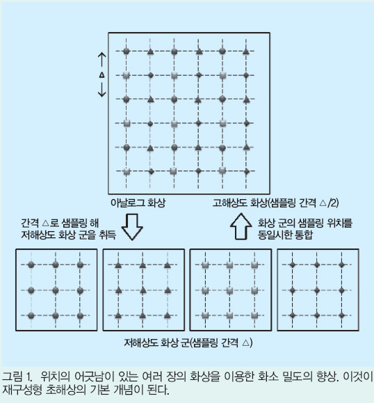 È¼Ò ¹Ðµµ¸¦ Çâ»ó½ÃŰ´Â ´ëÇ¥ÀûÀÎ ¹æ¹ýÀÇ Çϳª´Â À§Ä¡ ¾î±ß³²ÀÌ ÀÖ´Â ¿©·¯ ÀåÀÇ ÀúÇØ»óµµ È»óÀ» ÀÌ¿ëÇÏ´Â °ÍÀÌ´Ù. ¾Æ³¯·Î±× ½ÅÈ£°¡ 2Â÷¿øÀûÀ¸·Î È®»êµÈ ¾Æ³¯·Î±× È»óÀ̶ó ºÒ·¯¾ß ÇÏ´Â °ÍÀÇ Á¸À縦 °¡Á¤ÇÏ¸é µðÁöÅÐ È»óÀÇ °¢ ȼҴ ÀÏÁ¤ °£°ÝÀ¸·Î »ùÇøµµÈ Ç¥º»Á¡ÀÌ¶ó °¡Á¤ÇÒ ¼ö ÀÖ´Ù. ±×¸² 1¿¡ ³ªÅ¸³»´Â °Íó·³ ¼¼·Î ¹× °¡·Î ¹æÇâÀ¸·Î ¡â/2¸¸ »ùÇøµ À§Ä¡¸¦ ºñÄѳõ´Â °ÍÀ¸·Î ¾Æ³¯·Î±× Ȼ󿡼 4ÀåÀÇ È»óÀ» ¾òÀ» ¼ö ÀÖ´Ù.