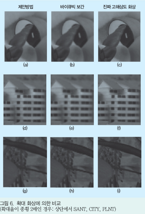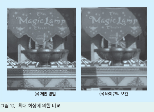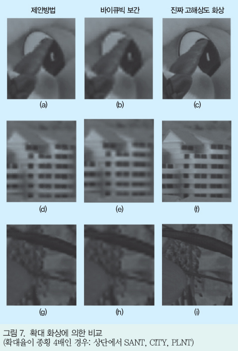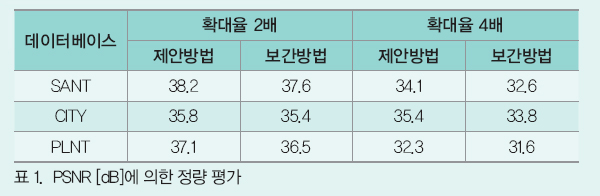 ¿©±â¿¡¼´Â 2¹è È®´ë¿¡ ´ëÇØ¼´Â È»ó Àüü¿¡¼ PSNRÀ» ±¸Çϰí ÀÖÀ¸¸ç 4¹è È®´ë¿¡ ´ëÇØ¼´Â ÁÜ È»óÀÇ ¿µÇâÀÌ ¹ÌÄ¡´Â ¹üÀ§(ÁÜ Ä«¸Þ¶óÀÇ ½Ã¾ß°¢ ³», ±×¸² 2 ÂüÁ¶)·Î ÇÑÁ¤ÇØ PSNRÀ» »êÃâÇß´Ù. ¾î´À ÂÊÀÇ Æò°¡ È»ó, È®´ëÀ²¿¡¼µµ Á¦¾È ¹æ¹ýÀº ¹ÙÀÌÅ¥ºò º¸°£À» »óȸÇÏ´Â ¼öÄ¡¸¦ ³ªÅ¸³»°í ÀÖ´Ù. ƯÈ÷ È®´ëÀ²À» 4¹è·Î ÇÑ °æ¿ì¿¡¼´Â 2¹èÀÇ °æ¿ì¿Í ºñ±³ÇØ ¾ç ¹æ¹ý °£ÀÇ PSNRÀÇ Â÷°¡ È®´ëµÇ°í ÀÖ¾î °í¹èÀ²ÀÇ »óȲ¿¡ ÀÖ¾î¼ÀÇ Á¦¾È ¹æ¹ýÀÇ À¯È¿¼ºÀÌ ½Ã»çµÇ°í ÀÖ´Ù.