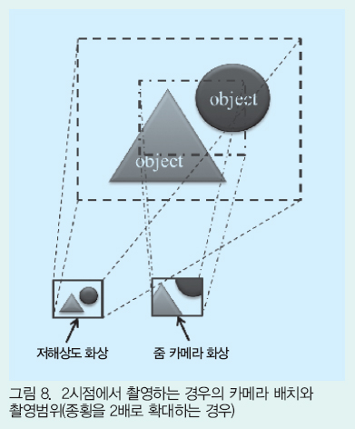 ¿©±â¿¡¼´Â ±×¸² 2¿¡ ³ªÅ¸³»´Â °Íó·³ 5´ëÀÇ Ä«¸Þ¶ó¸¦ ÀÌ¿ëÇÏ´Â »óȲÀ» »óÁ¤ÇÑ´Ù(Æò°¡ ½ÇÇèÀÇ ÀϺο¡¼ 2´ëÀÇ Ä«¸Þ¶ó¸¦ ÀÌ¿ëÇÏ´Â »óȲÀ» ´Ù·ë). Áß¾Ó¿¡ ¹èÄ¡µÈ 1´ëÀÇ Ä«¸Þ¶ó´Â »ó´ëÀûÀ¸·Î ÀúÇØ»óµµÀÇ È»óÀ» ±¤°¢À¸·Î ÃëµæÇÑ´Ù. ÁÖº¯¿¡ ¹èÄ¡µÈ 4´ëÀÇ Ä«¸Þ¶ó´Â »ó´ëÀûÀ¸·Î °íÇØ»óµµÀÇ È»óÀ» ÃëµæÇÏÁö¸¸, È¼Ò ¼ö´Â ÀÏÁ¤Çϱ⠶§¹®¿¡ ½Ã¾ß°¡ Á¼Àº ÁÜ È»óÀ» ¾òÀ» ¼ö ÀÖÀ¸¸ç Áß¾ÓÀÇ Ä«¸Þ¶ó¿¡¼ ¾òÀ» ¼ö ÀÖ´Â ÀúÇØ»óµµ È»ó¿¡ ´ëÇØ ÃÊÇØ»ó 󸮸¦ ÇÏ´Â °ÍÀ» ¸ñÀûÀ¸·Î ÇÑ´Ù. ¶ÇÇÑ, Á¾È¾À» 2¹è ¹× 4¹è·Î È®´ëÇÏ´Â »óȲÀÌ ´ë»óÀ¸·Î È®´ëÀ²°ú ÁÜ ¹èÀ²Àº °°Àº °ÍÀ¸·Î ÇÑ´Ù. ÀÌ¿¡ µû¶ó ±×¸² 2¿¡ ³ªÅ¸³»´Â °Íó·³ ÁÜ È»ó°ú ÀúÇØ»óµµ È»óÀÌ °ãÄ¡´Â ºÎºÐÀÌ ¹èÀ²¿¡ ÀÇÇØ ´Ù¸£´Ù´Â °ÍÀ» ÁÖÀÇÇØ¾ß ÇÑ´Ù.