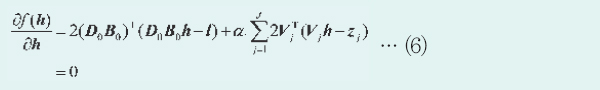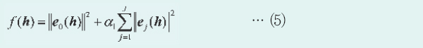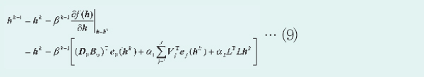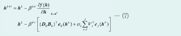 Çà·Ä {Vj}¿¡ ´ëÇØ¼µµ ÃßÁ¤ ´ë»óÀÓÀ» °Á¶Çϱâ À§ÇØ ÀÌÈÄÀÇ ±â¼ú¿¡¼´Â ¸ñÀû ÇÔ¼ö(8)¸¦ ¹ÌÁö º¯¼ö h¿Í {Vj}ÀÇ ÇÔ¼ö¶ó°í °£ÁÖÇϰí f(h, {Vj})À¸·Î ±âÀçÇÑ´Ù. »ó±â¿Í °°ÀÌ °íÇØ»óµµ È»ó º¤ÅÍ h¿Í Çà·Ä {Vj}¸¦ ¹ø°¥¾Æ ÃßÁ¤ÇÔÀ¸·Î½á ÇÔ¼ö f(h, {Vj})°¡ °»½Å Ƚ¼ö k¿¡ °üÇØ ´ÜÁ¶·Ó°Ô °¨¼ÒÇØ ´ë¿ªÀû ÃÖÀûÇØ¿¡ ¼ö¼Ó(â¥áÖ)ÇÑ´Ù´Â º¸ÁõÀº ¾ø¾îÁø´Ù. ±×·¯³ª Çà·Ä{Vj}ÀÇ °»½ÅÀº ¸¹Àº °æ¿ì¿¡ ½Ä(4)·Î ³ªÅ¸³ª´Â ¿ÀÂ÷¸¦ °¨¼Ò½ÃŰ´Â ¹æÇâÀ¸·Î ÀÛ¿ëÇÑ´Ù°í º»´Ù. ±×·¯¸é ÇÔ¼ö f(h, {Vj})ÀÇ °ªÀº °¨¼ÒÇϱ⠶§¹®¿¡ °á°úÀûÀ¸·Î (ÁØ)ÃÖÀûÇØ¿¡ Á¡Á¡ °¡±î¿öÁø´Ù°í ¿¹ÃøÇÑ´Ù.