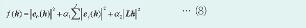 ·Î ´Ù½Ã Á¤ÀÇÇÏ´Â °ÍÀ¸·Î ÇÑ´Ù. º¯¼ö a1, a2´Â °¢ Ç×ÀÇ ¹«°Ô¸¦ Á¦¾îÇÏ´Â ¸Å°³º¯¼öÀÌ´Ù. ¶ÇÇÑ, M X M Â÷¿ø Çà·Ä LÀº ¶óÇöó½Ã¾È ÇÊÅÍ Ã³¸®¿¡ ´ëÀÀÇϰí, LÀÇ Á¦ m(=1, 2, ..., M)ÇàÀº °íÇØ»óµµ È»óÀÇ m¹øÂ°ÀÇ È¼Ò¿¡ ´ëÇÑ ÇÊÅÍ °è¼ö°¡ µÈ´Ù. µû¶ó¼ Lh´Â °íÁÖÆÄ ¼ººÐÀ» °ÇÏ°Ô ¹Ý¿µÇÑ º¤ÅͰ¡ µÈ´Ù. ½Ä(8)À» ¸ñÀû ÇÔ¼ö·Î ÇÏ´Â °ÍÀ¸·Î °íÁÖÆÄ ¼ººÐÀ» ÀûÀýÇÏ°Ô ¾ïÁ¦ÇÑ ÇØ¼®À» ¾òÀ» ¼ö ÀÖ´Â °ÍÀ» ±â´ëÇϰí ÀÖ´Ù. ¶ÇÇÑ, ºñ½ÁÇÑ ¼±Çè Áö½ÄÀ» ä¿ëÇϱâ À§ÇØ ½Ä(8)ÀÇ ¿ìº¯ Á¦3Ç×À» Ǫ¸®¿¡ º¯È¯¿¡ ÀÇÇØ ±¸ÇÏ´Â °íÁÖÆÄ ¼ººÐÀÇ ÃÑÇÕ(°í¿ª ÇÊÅÍ)À̳ª Àüº¯µ¿ ³ë¸§8) µîÀ¸·Î ġȯÇÏ´Â °Íµµ °¡´ÉÇÏ´Ù.