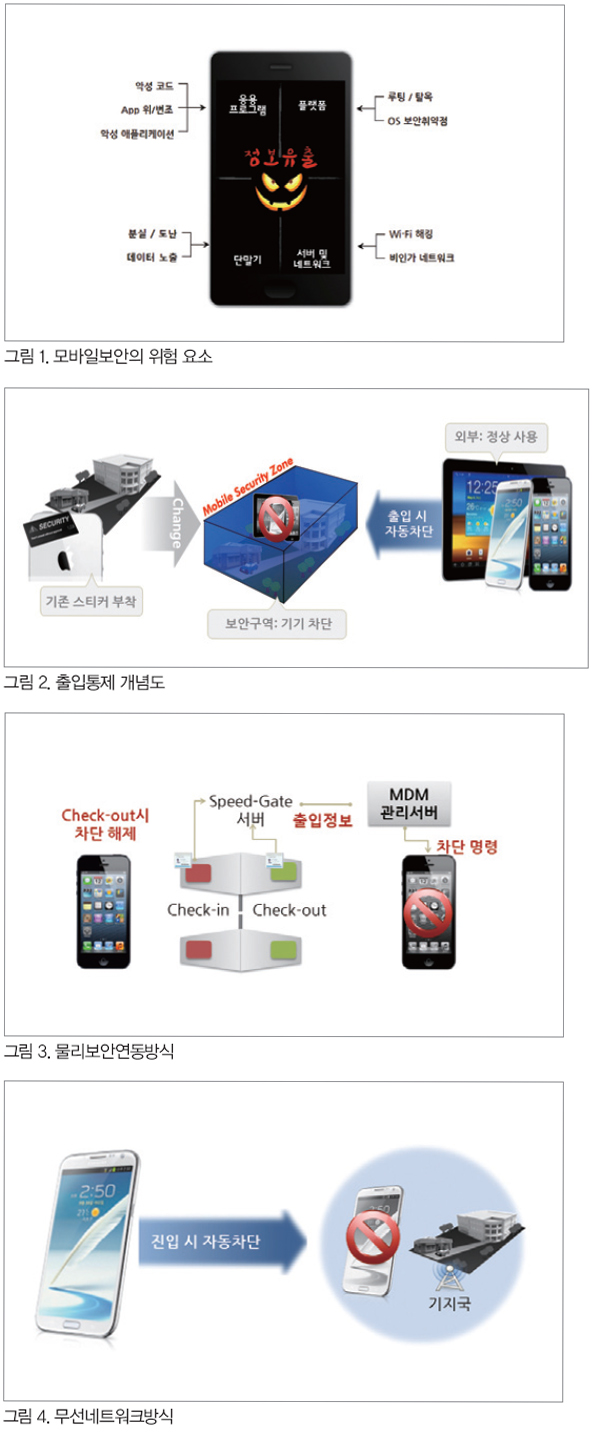 ¿¬±¸¼Ò, Áö½Ä±â¹Ý»ê¾÷ü, ±º °ü·Ã ±â°ü µîÀº ¸ðµÎ ȸ»ç ³»ºÎÀÇ ÇÙ½ÉÁ¤º¸¿¡ ´ëÇØ Ä«¸Þ¶ó, ³ìÀ½±â, USB µîÀ» ÅëÇØ ¿ÜºÎ¿¡ À¯ÃâµÇ´Â °ÍÀ» ¹æÁöÇϰíÀÚ ÇÑ´Ù. ÀÌ ¶§¹®¿¡ ¸ð¹ÙÀÏ ±â±âÀÇ »ç³» ÃâÀÔ¿¡ ´ëÇÑ ¾ö°ÝÇÑ ÅëÁ¦°¡ ÇÊ¿äÇѵ¥, ±âÁ¸ÀÇ ½ºÆ¼Ä¿ ºÎÂø ¹æ½Ä, º¸¾È¿ä¿øÀÇ ÀúÀå¸Åü/¸ÖƼ¹Ìµð¾î °³Ã¼(USB, µðÁöÅÐÄ«¸Þ¶ó) ÅëÁ¦´Â ÃâÅð±Ù ½Ã°£¿¡ ´ë±â½Ã°£ÀÌ ±æ¾îÁö°í, ¸ð¹ÙÀÏ ±â±â¿¡ ³»ÀåµÈ Ä«¸Þ¶ó, ³ìÀ½±â µî Á¤º¸À¯ÃâÀÇ Åë·Î°¡ µÇ´Â ¾ÛÀ» ÅëÁ¦Çϱ⿡´Â ¿ªºÎÁ·À̾ú´Ù.