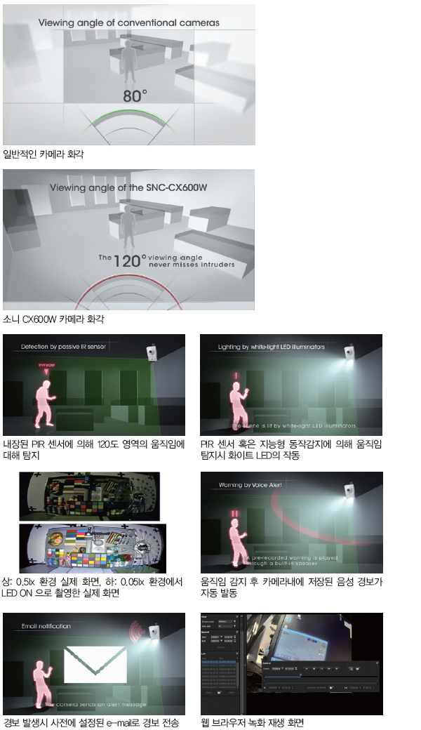 ÇØ´ç ±â´ÉÀº Àû¿Ü¼±(PIR) ¼¾¼¿Í ¿¬µ¿µÅ »ç¹°ÀÇ ¿òÁ÷ÀÓÀ» °¨ÁöÇϰí À̸¦ ±â¹ÝÀ¸·Î ³»ÀåµÈ ÈÀÌÆ® LED ¶óÀÌÆ®°¡ ÀÚµ¿À¸·Î ºÒÀ» ¹àÈ÷±â ¶§¹®¿¡, ¾îµÎ¿î ȯ°æ¿¡¼µµ ¿Ïº®ÇÏ°Ô ¿µ»óÀ» ÃÔ¿µÇÒ ¼ö ÀÖ´Ù. ¶ÇÇÑ, ÀÚµ¿ ³ìÈ ¹× ÄÜÅÙÃ÷ÀÇ À̸ÞÀÏ Àü¼ÛÀÌ °¡´ÉÇϸç ÃÖ½ÅÀÇ Exmor CMOS À̹ÌÁö ¼¾¼°¡ žÀçµÅ ÀúÁ¶µµ ȯ°æ¿¡¼µµ Ź¿ùÇÑ ¿µ»ó ÃÔ¿µÀÌ °¡´ÉÇÏ´Ù.