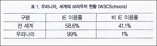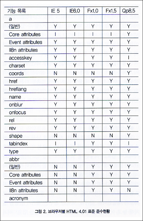 ¿©±â¼ ¹®Á¦´Â ¾î´À ºê¶ó¿ìÀúµçÁö ¸ðµç Ç¥ÁØÀ» ÁؼöÇÏ´Â °ÍÀº ¾Æ´Ï´Ù.(±×¸²2 Âü°í) ºê¶ó¿ìÀú¸¶´Ù W3C µîÀÇ Ç¥ÁØÀ» ÁؼöÇÏ´Â Ç׸ñ¿¡ Â÷À̰¡ ÀÖ°í ÃֽŠǥÁØÀ» ÁؼöÇÏÁöµµ ¸øÇÒ »Ó ¾Æ´Ï¶ó, °¢±â »ç¿ëÀÚ¿¡°Ô º°µµ·Î ÇÊ¿äÇÑ ±â´ÉÀ» ¸¸µé¾î¼ Á¦°øÇϱ⵵ ÇÑ´Ù. µû¶ó¼ ´Ù¾çÇÑ »ç¿ëÀÚÀÇ ¿ä±¸»çÇ×À» ¸¸Á·½Ã۱â À§Çؼ´Â ºê¶ó¿ìÀúº° Ç¥ÁØ Áö¿øÇöȲÀ» ºÐ¼®ÇÏ¿© ¸¹Àº ºê¶ó¿ìÀú°¡ Áö¿øÇϴ ǥÁØÇ׸ñÀ» Á¤Çϰí À̸¦ ÇʼöÀûÀ¸·Î ÁؼöÅä·Ï °Á¦ÈÇÏ´Â Á¤Ã¥ÀÌ ÇÊ¿äÇÏ´Ù.