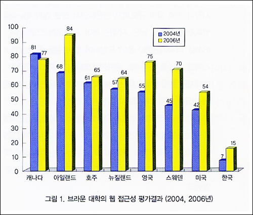 2004³â°ú 2006³â¿¡ ¹Ì±¹ ºê¶ó¿î ´ëÇп¡¼ ¡®W3C À¥ ÄÜÅÙÃ÷ Á¢±Ù¼º Áöħ 1.0¡¯ÀÇ Àû¿ë ÇöȲÀ» °¢±¹ÀÇ ÀüÀÚÁ¤ºÎ »çÀÌÆ®¸¦ ´ë»óÀ¸·Î Æò°¡ÇÑ °á°ú¸¸ º¸´õ¶óµµ ¿ì¸®³ª¶ó´Â Àü ¼¼°è Æò±Õ(2004³â 14%, 2006³â 23%)¿¡µµ ÈξÀ ¸ø ¹ÌÄ¡´Â °á°ú¸¦ º¸¿©ÁØ´Ù.(±×¸² 1 Âü°í) Ç¥ÁØÀ» ÁؼöÇÏÁö ¾Ê¾Æ ¹ß»ýÇÑ ¹®Á¦´Â ÃÖ±Ù MS»ç¿¡¼ À©µµ OSÀÇ ¹öÀüÀ» ¾÷±×·¹À̵å ÇÏ¸é¼ º¸´Ù ±Ø¸íÇÏ°Ô µå·¯³µ´Ù.