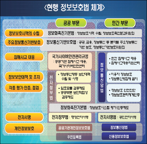 ù°, Á¤º¸º¸È£ Á¤Ã¥¡¤Àǹ« °ü·Ã ±ÔÁ¤ÀÌ ¿©·¯ ¹ý·É¿¡ ºÐ»êµÅ ÀÖ¾î ü°èÀûÀ̰í ÅëÇÕÀûÀÎ Á¤º¸º¸È£ Á¤Ã¥ ¼ö¸³°ú ¹ý ÁýÇàÀÌ ¾î·Æ´Ù. Á¤º¸Åë½Å¸Á¹ý, Á¤º¸ÈÃËÁø±âº»¹ý, ÀüÀÚÁ¤ºÎ¹ý, ±¹°¡»çÀ̹ö¾ÈÀü±ÔÁ¤ µî ¿©·¯ ¹ý·É¿¡ Á¤º¸º¸È£½ÃÃ¥¼ö¸³, Ä§ÇØ»ç°í´ëÀÀü°è, Á¤º¸º¸È£ Æò°¡¡¤ÀÎÁõÁ¦µµ µîÀÌ ºÐ»ê¡¤±ÔÁ¤µÇ¾î ÀÖ°í À̵é Á¦µµÀÇ ¿î¿µµµ °¢°¢ °ø°øºÎ¹®°ú ¹Î°£ºÎ¹®À¸·Î ³ª´µ¾î ÀÖ´Ù º¸´Ï Á¤º¸º¸È£Ã¼°è°¡ À¯±âÀûÀ¸·Î ÅëÇյǾî ÀÖÁö ¸øÇÏ´Ù.
