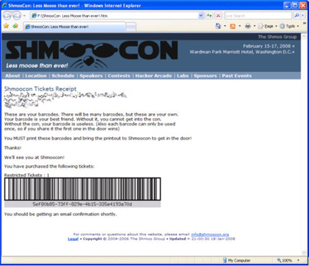 ÇÊÀÚ´Â ¼¼ ¹øÀÇ µî·ÏÀÏ¿¡ µî·ÏÀ» ÇÏÁö ¸øÇß´Ù. ƼÄÏÀ» ±¸ÇÏÁö ¸øÇØ Âü°¡¸¦ Æ÷±âÇϰí ÀÖ´Ù°¡ ShmooCon ¿î¿µÀÚ Bruce¿¡°Ô ¸ÞÀÏÀ» º¸³» ƼÄÏÀ» ±¸ÇÒ ¼ö ÀÖ´Â ¹æ¹ýÀÌ ÀÖ´ÂÁö È®ÀÎÇØº¸¾Ò´Ù. ±×·¯³ª ±¸ÇÒ ¼ö ¾ø´Ù´Â ´äº¯¸¸ ÀÖ¾ú´Ù. °ÅÀÇ Æ÷±âÇϰí ÀÖ´Ù°¡ ShmooCon2008 ¹ßÇ¥ÀÚ Áß¿¡ atlas°¡ ÃÖÁ¾ÀûÀ¸·Î Æ÷ÇÔµÈ °ÍÀ» º¸°í ±×¿¡°Ô ¸ÞÀÏÀ» º¸³Â´Ù.